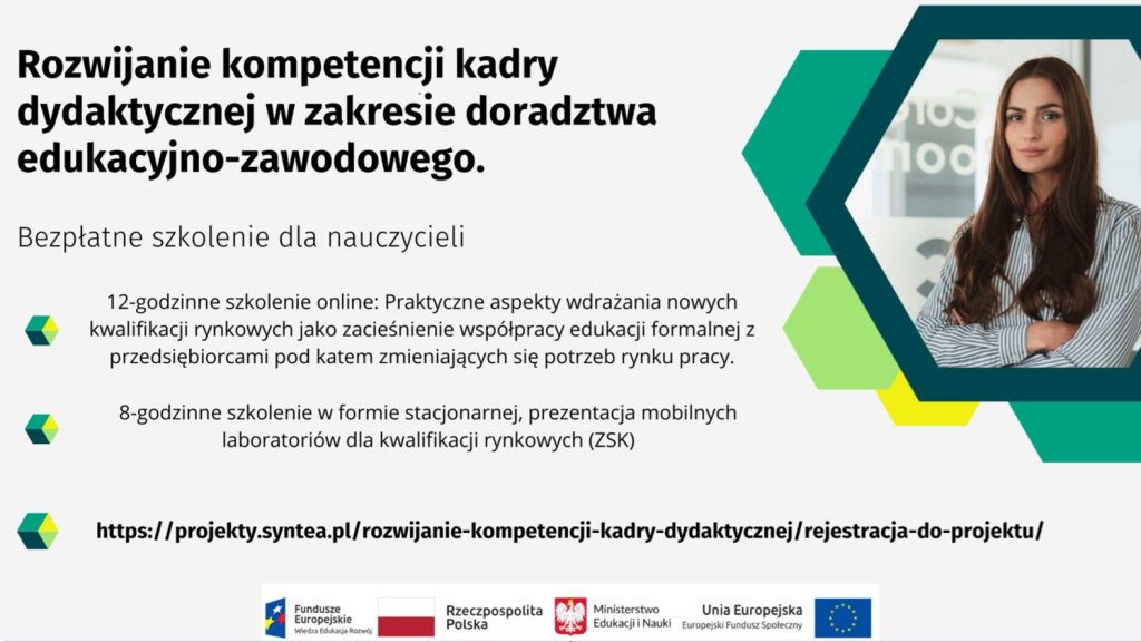 W imieniu organizatorów zapraszamy wszystkich nauczycieli realizujących zadania z zakresu doradztwa edukacyjno-zawodowego w szkołach podstawowych, liceach, technikach i szkołach branżowych I stopnia do udziału w bezpłatnym (finansowanym z funduszy Unii Europejskiej) szkoleniu zwiększającym kompetencje zawodowe. W projekcie mogą wziąć udział wszyscy członkowie rady pedagogicznej.