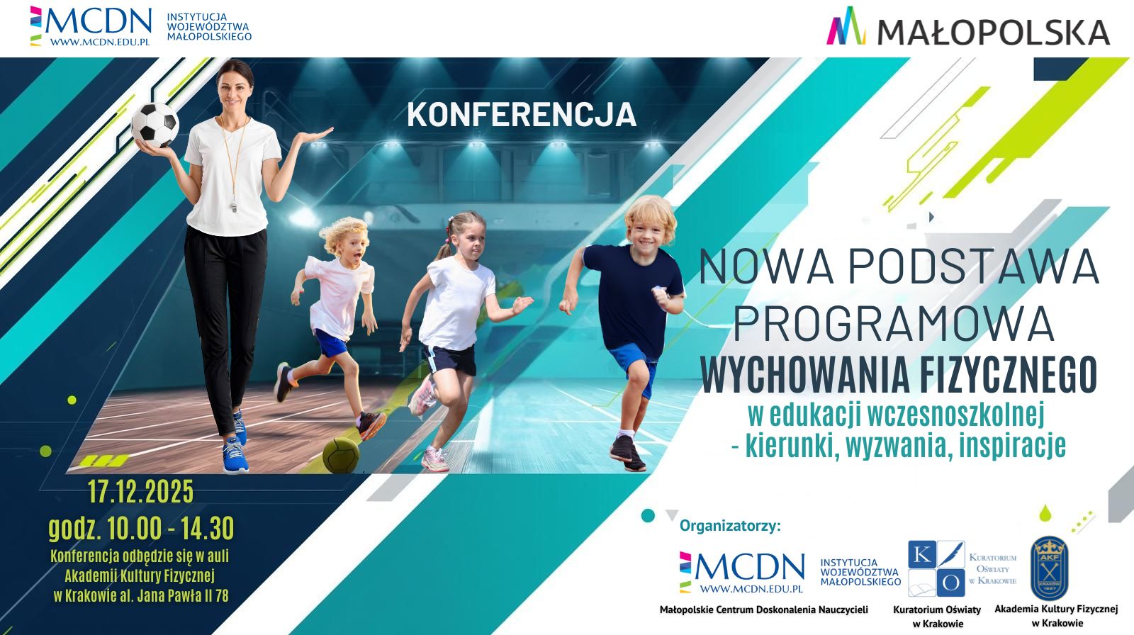 Wsparcie metodyczne nauczycieli wychowania fizycznego edukacji wczesnoszkolnej. Przedstawienie najważniejszych założeń nowej podstawy programowej, prezentacja wyników badań dotyczących warunków realizacji zajęć WF w małopolskich szkołach, a także omówienie narzędzi wspierających pracę nauczycieli takich jak programy „Mały Mistrz” czy „Sportowe Talenty”. Uczestnikom spotkania zostaną przedstawione rozwiązania organizacyjne wpływające na atrakcyjność, intensywność i bezpieczeństwo zajęć. Nauczyciele zyskają możliwość wymiany doświadczeń, skonfrontowania swoich praktyk z rozwiązaniami proponowanymi przez ekspertów oraz zdobycie wiedzy na temat kształtowania i diagnozowania sprawności uczniów. Ważnym aspektem będzie także zwrócenie uwagi na rolę rodziców i szkoły w kształtowaniu trwałych nawyków ruchowych i promowaniu zdrowego stylu życia od najmłodszych lat.