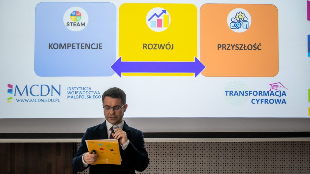 Szkolenie rozpoczęło się od powitania uczestników przez dr Łukasza Cieślika, Dyrektora MCDN, który podkreślił znaczenie współpracy między samorządami, organami prowadzącymi szkoły a dyrektorami szkół, co jest szczególnie ważne w procesie systemowych zmian.